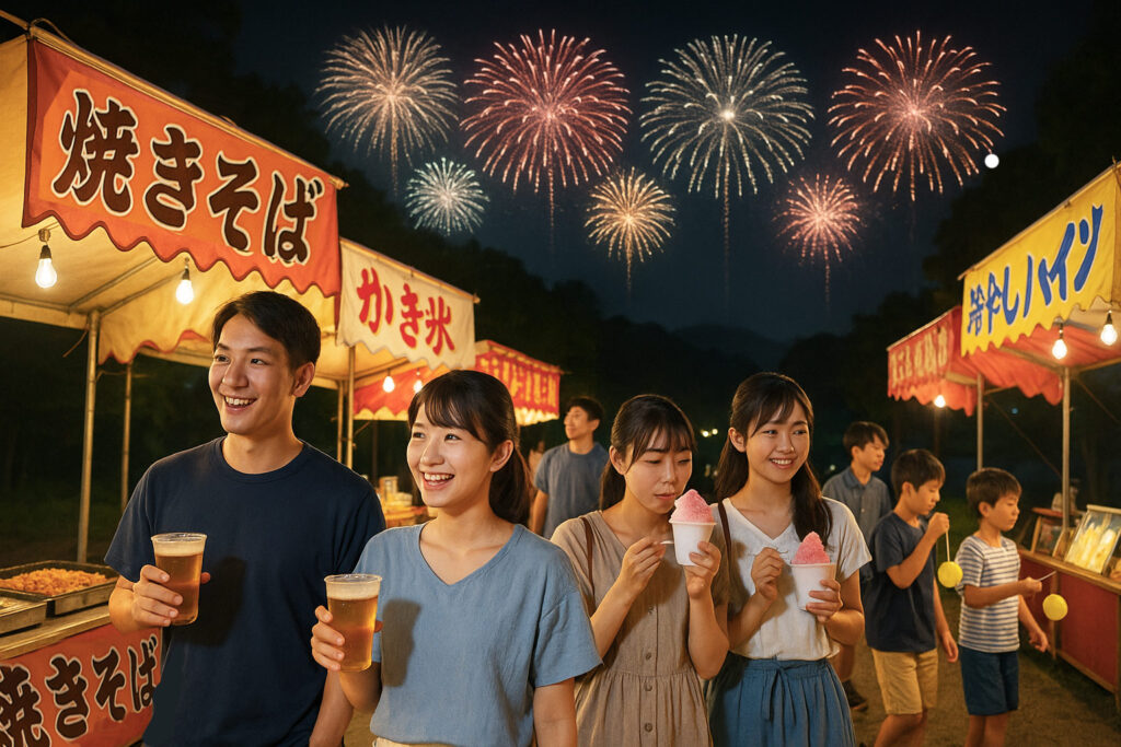 会場周辺には地元の飲食店や商工会による露店が軒を連ね、焼きそばやかき氷、冷やしパインなど夏ならではの味覚がずらり。家族連れやカップル、友人どうしが訪れ、食べ歩きや屋台ゲームを楽しみながら涼をとっていました。特に定番の「流しそうめん」や「じゃがバター」は早々に売り切れ、ビールも行列ができるほどの人気ぶりでした。